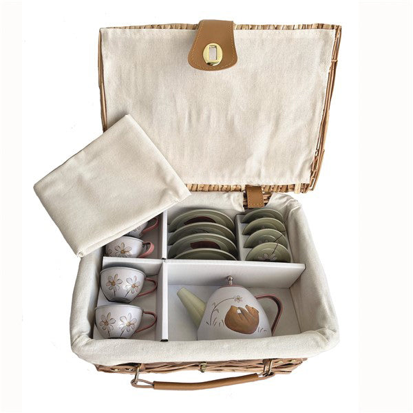 Spread out a blanket and pour pretend tea for teddy bears. This delightful wicker basket holds everything needed for magical garden parties and cosy indoor picnics.