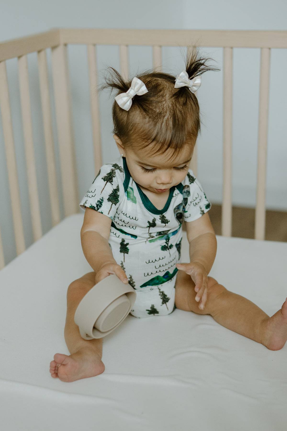Classic short sleeve onesie with snap bottom for easy diaper changes.  The envelope neckline makes dressing little ones quick and easy.  Made from buttery soft Bamboo Rayon, this onesie is the perfect daywear basic for babies.