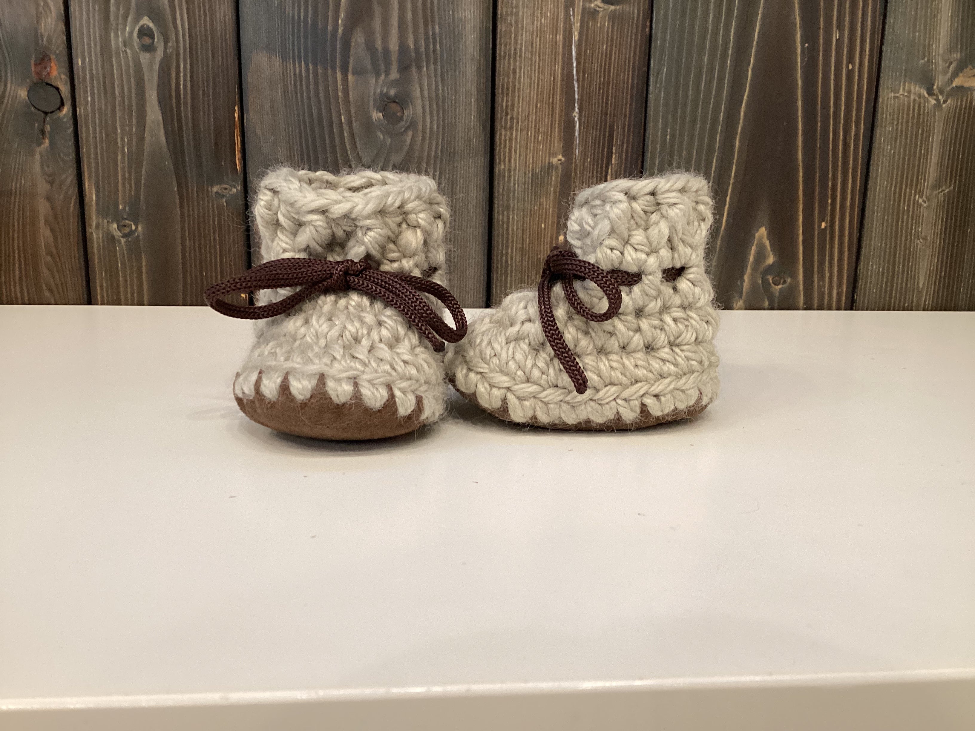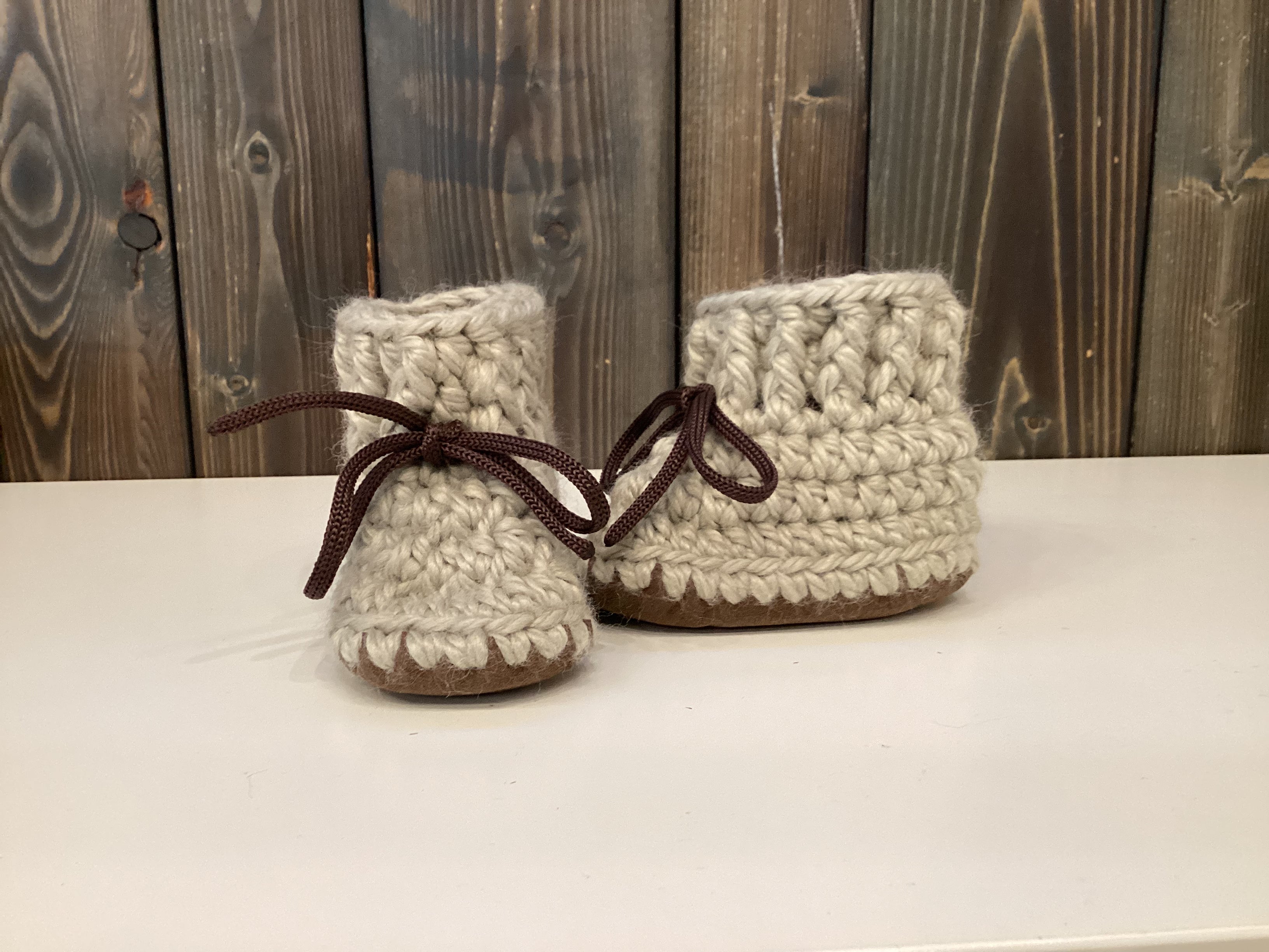 Lydias booties are made from a very durable faux suede, The yarn is a 20% wool acrylic blend that creates soft, warm comfort. These slippers will STAY PUT and are very easy to put on. Keep those little toes warm in the cold! The soft soles not only allow these slippers to grow with your baby but they are also weather-resistant and great for indoor and outdoor use and allow your bany to development the important muscles in their feet for motor development.  Please keep in Mind the crochet portion of the slipper is not very fond of puddles. If you do get them dirty spot wash or hand wash and let them air dry. Please do not place them in the dryer lay flat on a towel