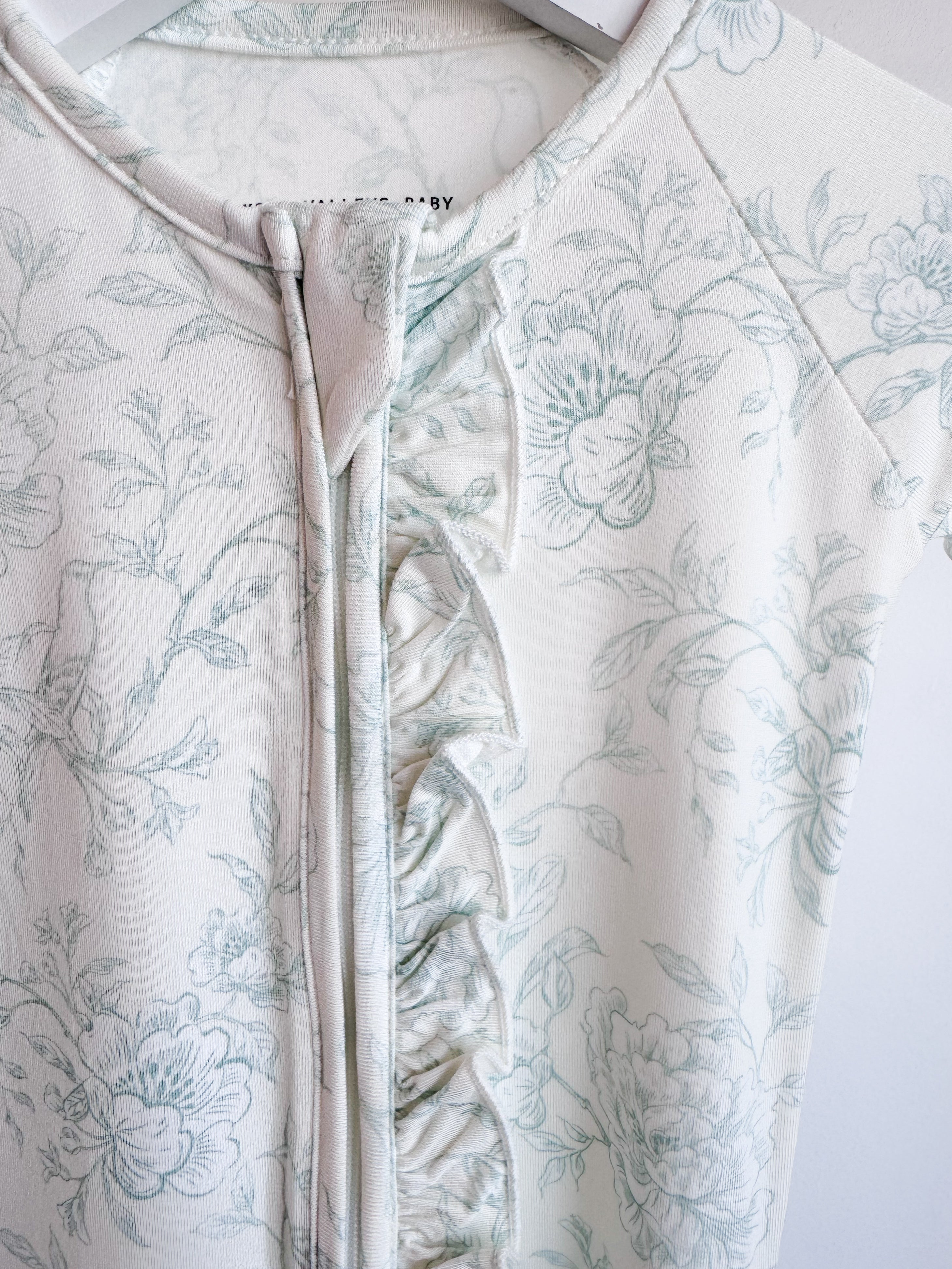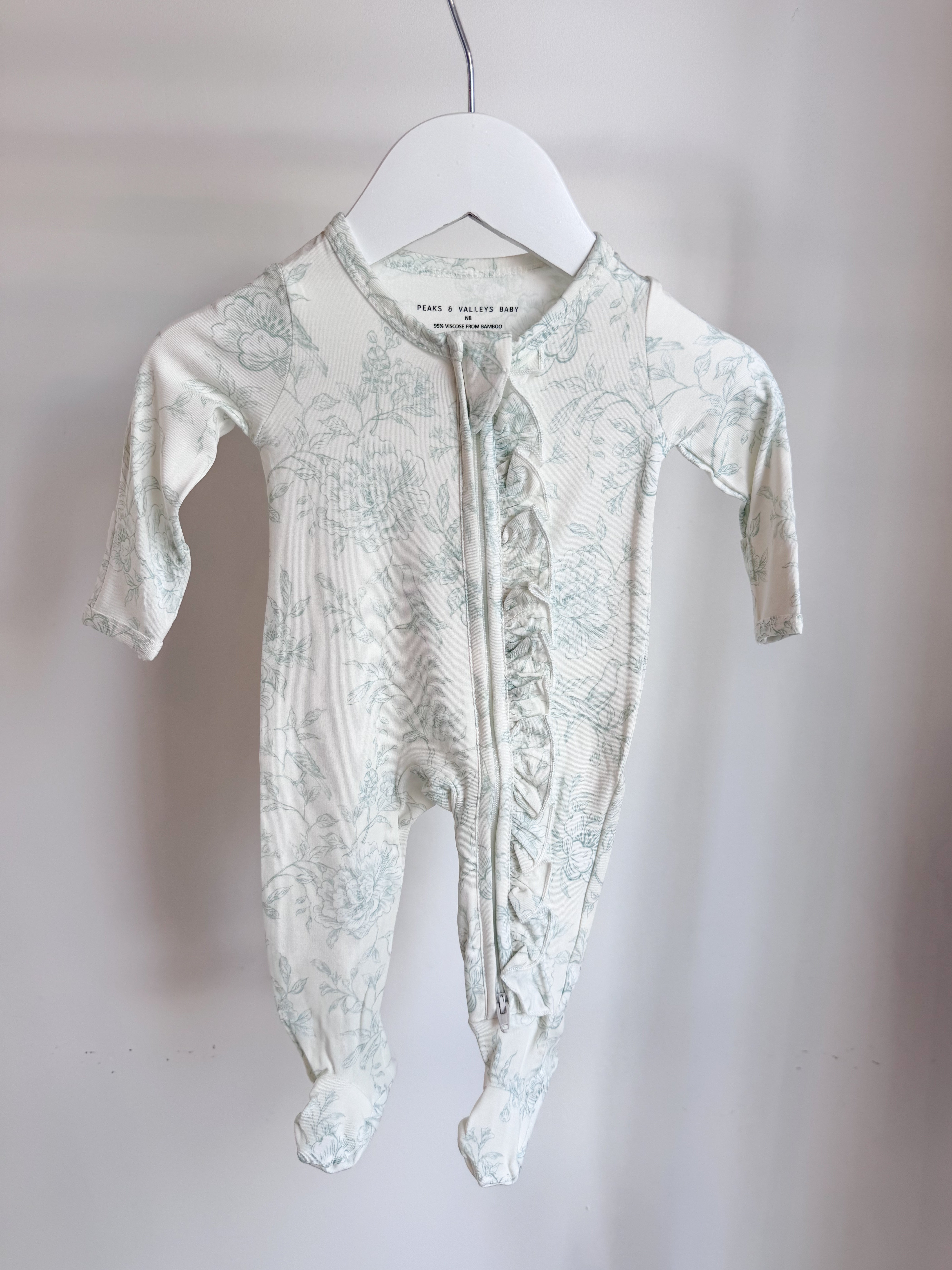 Footed sleeper made in soft bamboo rayon for the perfect night sleep. Bamboo is very breathable and moisture wicking which makes it the ideal fabric for infant sleepwear. 2-way zipper closure makes for easy diaper changes while fold over cuffs* and chin guard keep baby safe from scratches and pinches. Featuring a dainty ruffle zipper trim.