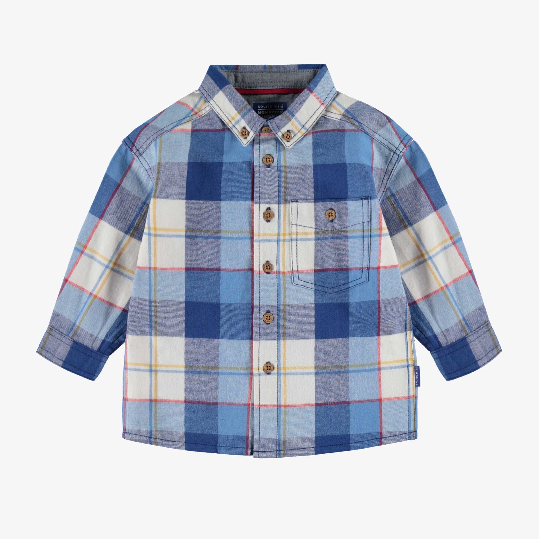 Blue plaid shirt in soft flannel. Features a shirt collar, a front pocket, and wood-look buttons. Designed in a relaxed fit for maximum comfort.