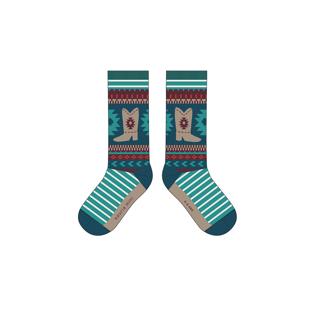 Turquoise socks with western-inspired patterns. The toe and heel are reinforced to increase durability. Pairs beautifully with styles from our collection.